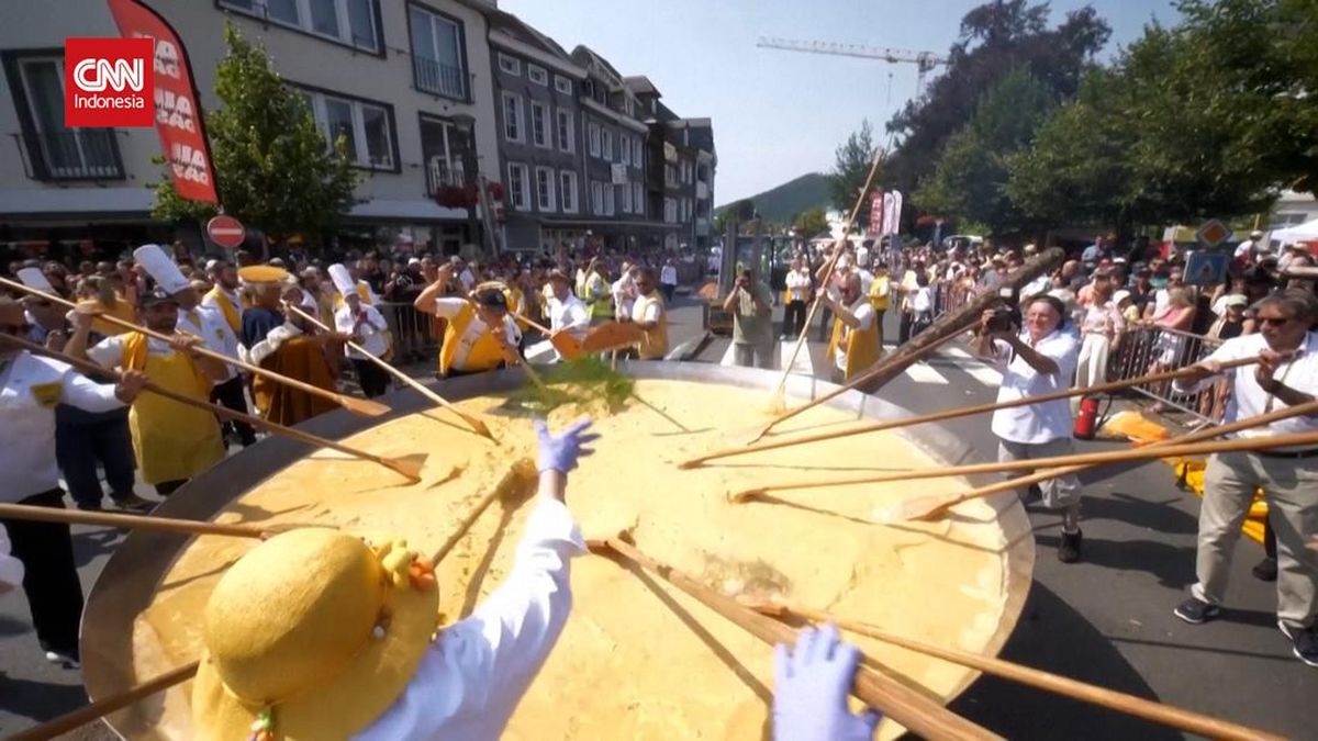 Para koki di kota Malmedy memecahkan dan mengocok ribuan telur dan dimasak menggunakan wajan selebar empat meter.