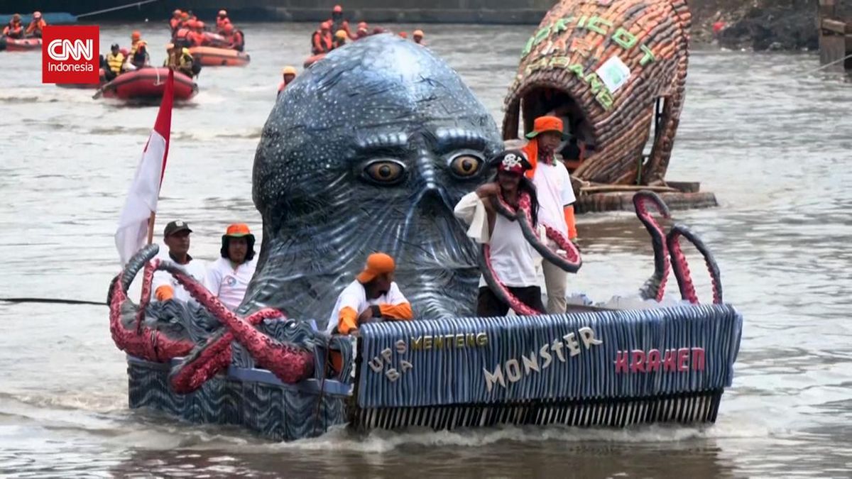 Lebih dari 40 perahu hias dari bahan daur ulang mengapung di Sungai Ciliwung, Jakarta, dalam rangka memperingati Hari Sungai Sedunia, Minggu (28/9).