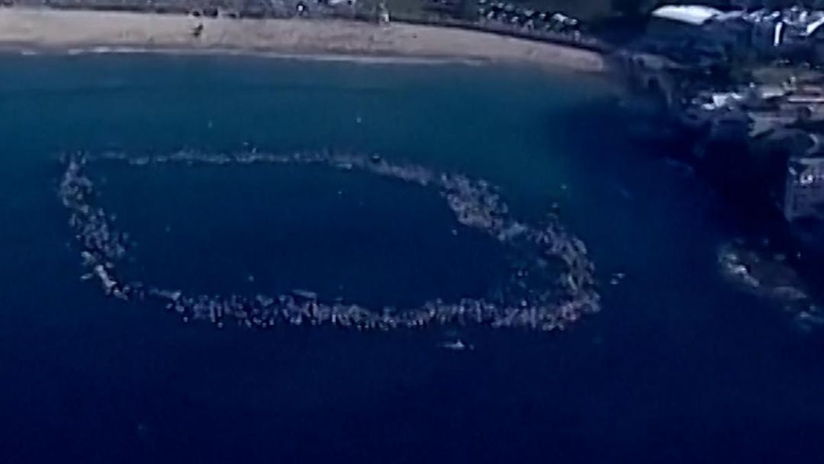 Ratusan perenang dan peselancar berkumpul di perairan Pantai Bondi, Sydney, Australia, untuk menghormati korban penembakan brutal, Jumat (19/12).